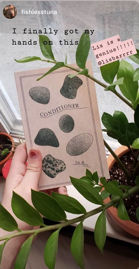 Quimby's says: "Liz Barr's second publication with GenderFail, Conditioner, looks at how the skincare and wellness industries have grown to inhabit the role of more dated beauty expectations--how dewy skin and perfect-but-effortless no-makeup makeup a la Glossier still play the same part in controlling and subjugating women. but Barr comes to a more complex conclusion--though these industries are just that, industries, built on a constructed and reinforced image of impossible beauty (synonymous with femininity) women can still find worth in the ritual, gentleness, sensuality of skin-and self-care."